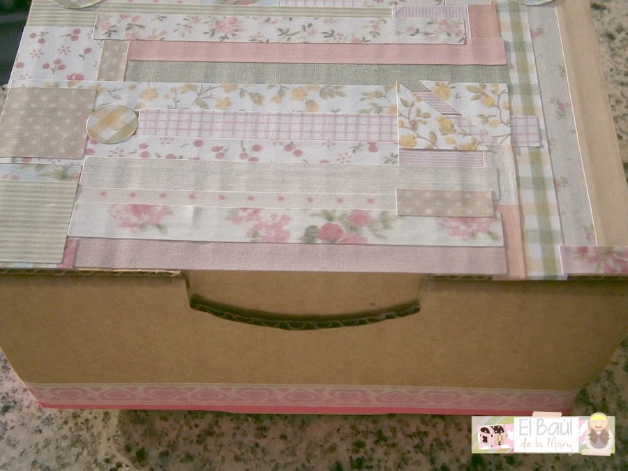 Para entregarlos, hemos elegido una cajita craft rectangular, le hemos puesto un poquito de papel de seda y por fuera le hemos hecho un patchwork con pegatinas washi