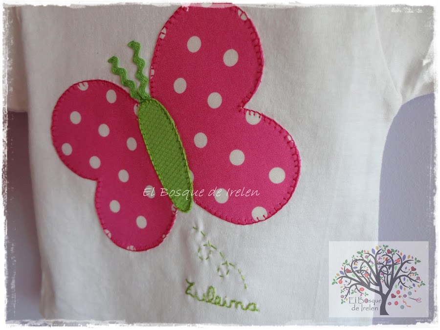 Y eso es lo que pasó con este conjunto de camiseta y clip, me lo encargaron para hacer un regalo para una bebé, la pequeña Zuleima y como a su mamá le encantan las mariposas pues le hice esta tan llamativa, probamos con varias telas y esta es la que más gustó, no me digaís que no ha quedado divertida.