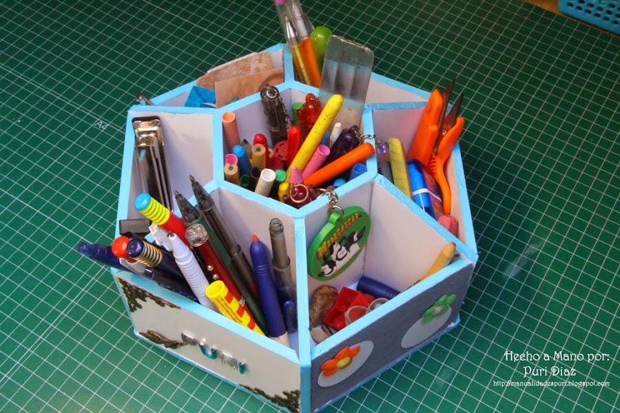 Una de las primeras clases que imparto en mi foro, (como se que muchas de vosotras queríais entrar a las clases y no sabéis usar el foro os quiero dar la oportunidad a todas de realizar las clases, si me ayudáis un poquito también a mi)os traigo este organizador de escritorio realizado en cartón pluma, cartón, madera o bandejitas recicladas de porexpan, la medida será para realizar a tu gusto y necesidades, dependiendo del espacio del que dispongas...¿te gusta? ¿quieres el tutorial?