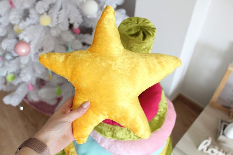 Ya veis que es una idea genial para los peques de casa, yo al final con la tela que me sobro hice más cojines. Además hice una estrella para la punta del árbol. Podéis adaptar los colores a vuestra decoración navideña.