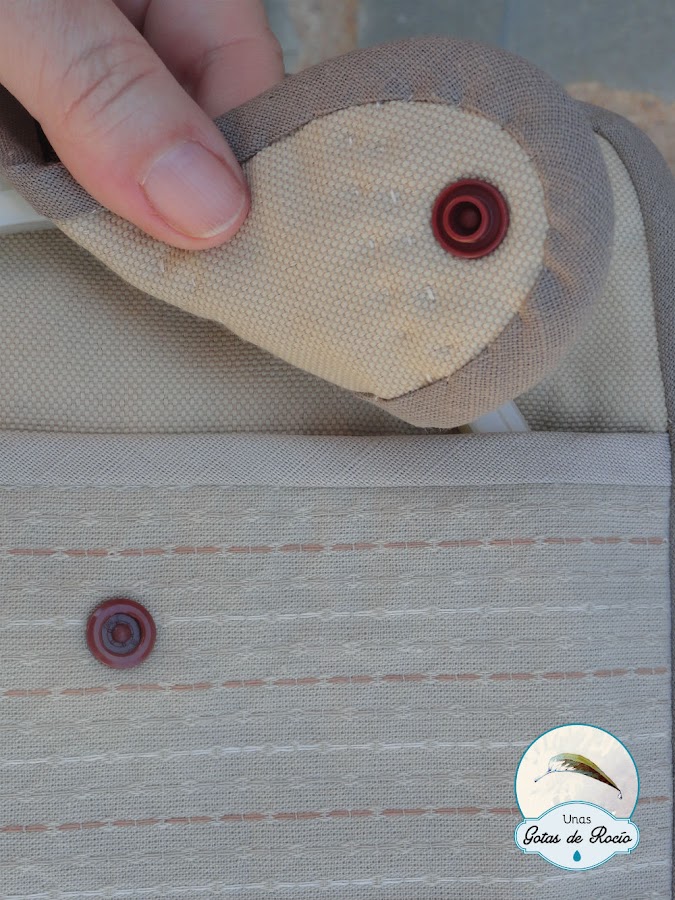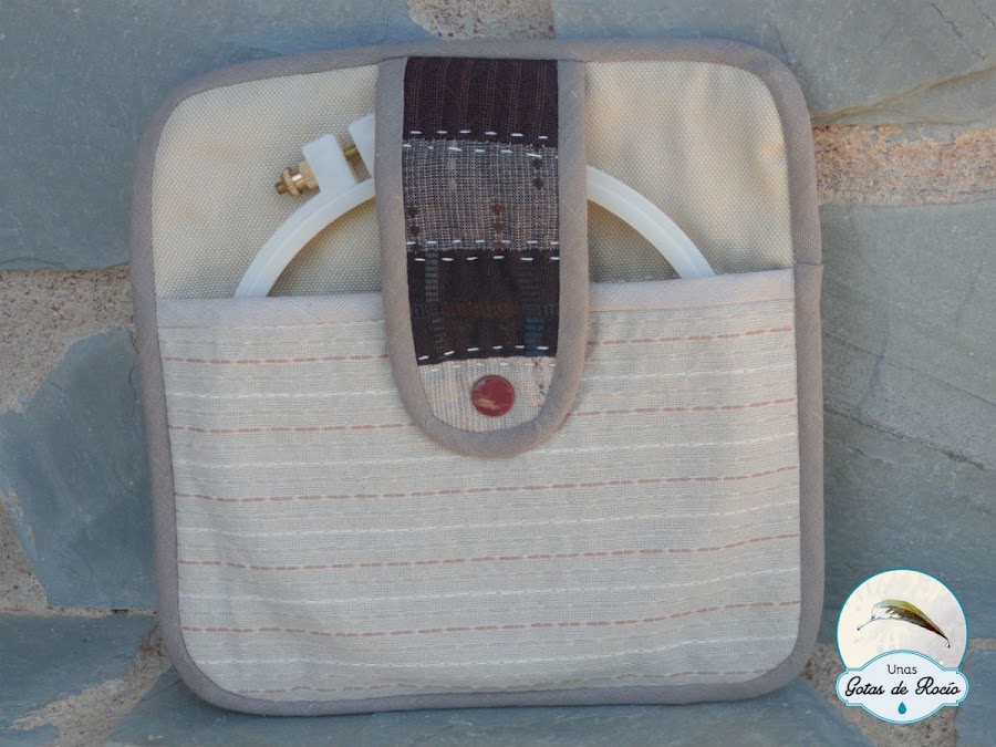 La funda es el bolsillo de una funda de un cuaderno que hice el año pasado por estas fechas y que tuve que repetir porque no calculé bien las medidas (te lo conté aquí). Aunque no sabía para qué me serviría, la guardé. Y es así que a partir de la funda para el bastidor de María José se me ocurrió adaptar la funda de cuaderno inservible en una funda de bastidor útil.