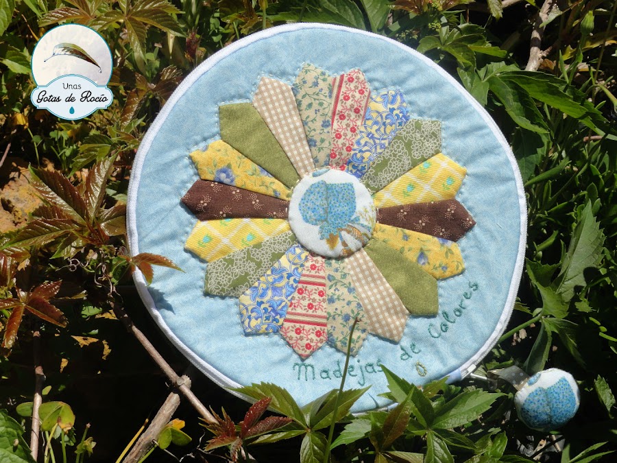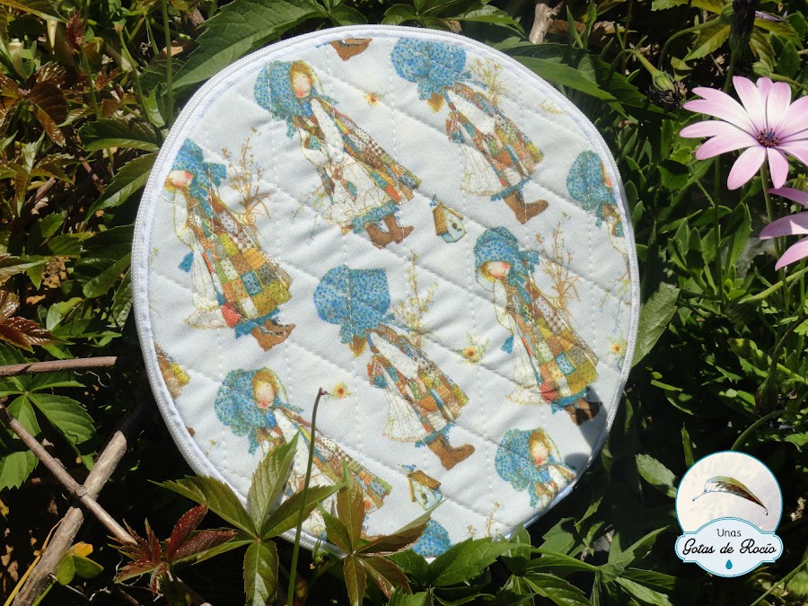 Sobre fondo azul (el color favorito de María José) decidí hacer un plato Dresden que tan bien combina con la forma redonda de la funda. Y para el centro, la muñequita Holly Hobbie que María José eligió como símbolo de su blog. La misma tela la reservé para la parte de atrás con un acolchado a rombos.