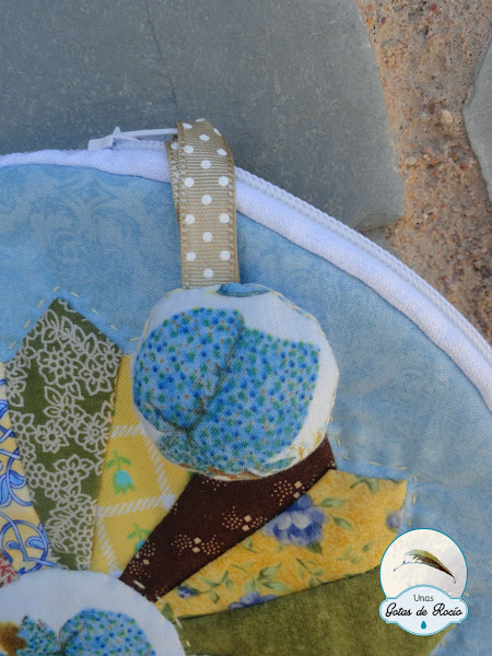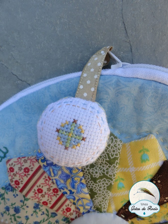 El nombre de su blog bordado junto a mi gota y los colores del plato a semejanza del delantal de la niña son algunos detalles. Además del tirador de la cremallera, con la misma niña por un lado y un dibujito a punto de cruz por el otro en tonos similares. Siendo María José una maestra en este bordado, se me ocurrió tal guiño.