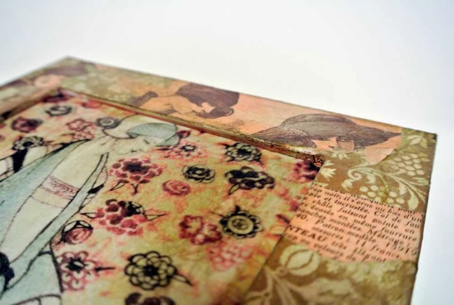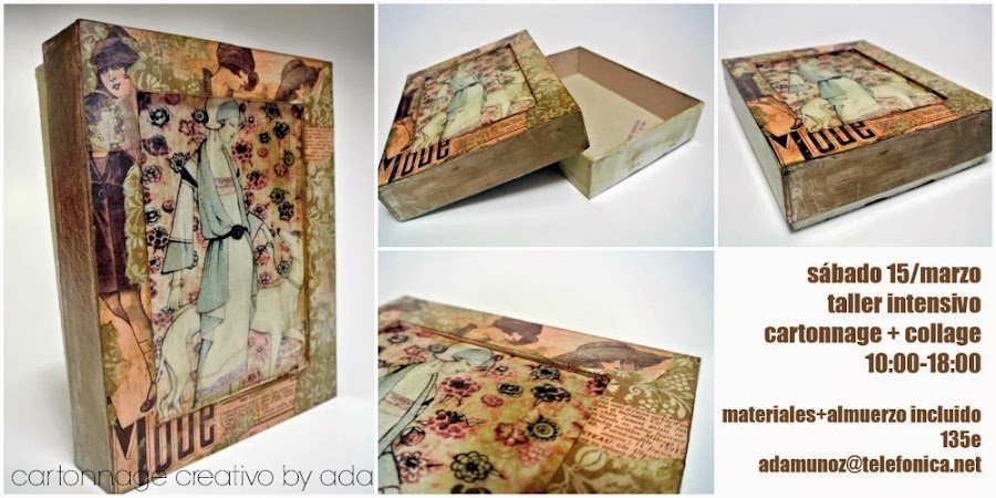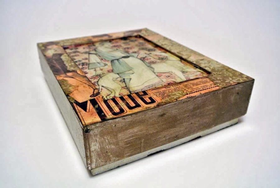 Una vez esté lista, os explicaré un sistema, creo que único, para hacer collage con diferentes papeles, pintura, tintas, sellos, etc y por último protegeremos la caja con barniz.