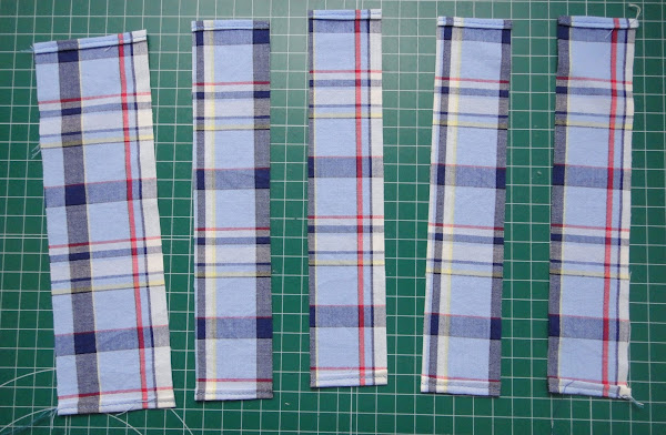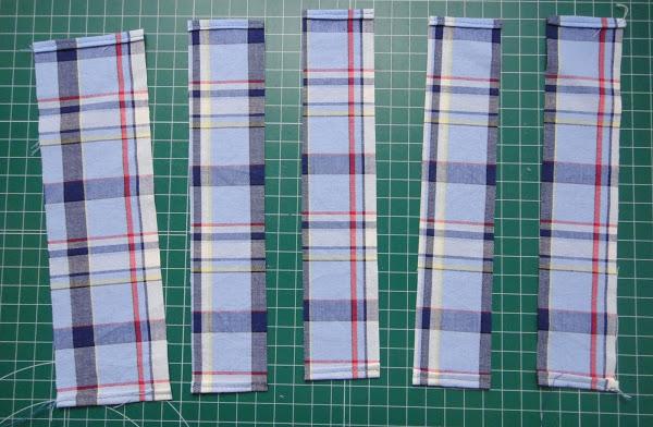 Cortamos la tela en tiras. Una de las tiras tiene que medir 6 cm de ancho, y las otras 4 cm de ancho. Obtenemos 5 tiras en total.