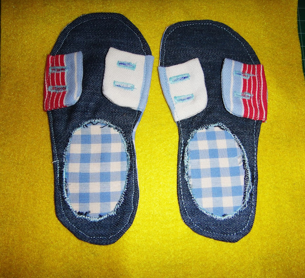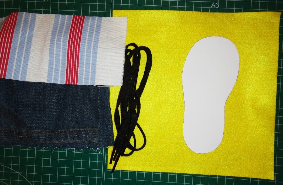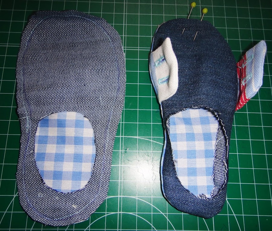 Haremos dos zapatos en la tela vaquera, dejando margen de costura respecto a nuestro patrón, y con dos agujeros que simulen el hueco para meter el pie. Ojo, tened en cuenta que tenéis que recortar los zapatos en espejo, para distinguir izquierdo y derecho.