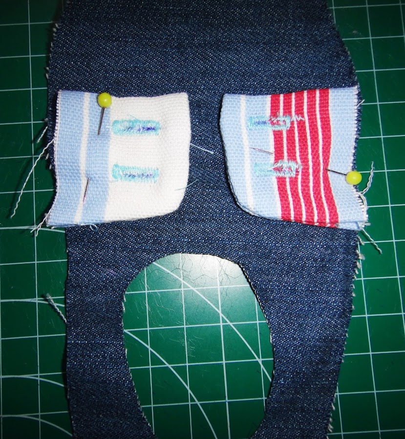 Normalmente cuando cosemos ponemos las telas derecho con derecho, y al dar la vuelta quedan los reveses por dentro y los derechos hacia afuera. Pero en esta ocasión queremos que nos queden los dos derechos hacia el mismo lado (uno hacia afuera y el otro dentro pero que se verá por el agujero), así que habrá que coser colocando el derecho de la tela vaquera enfrentado con el revés de la tela estampada.