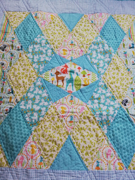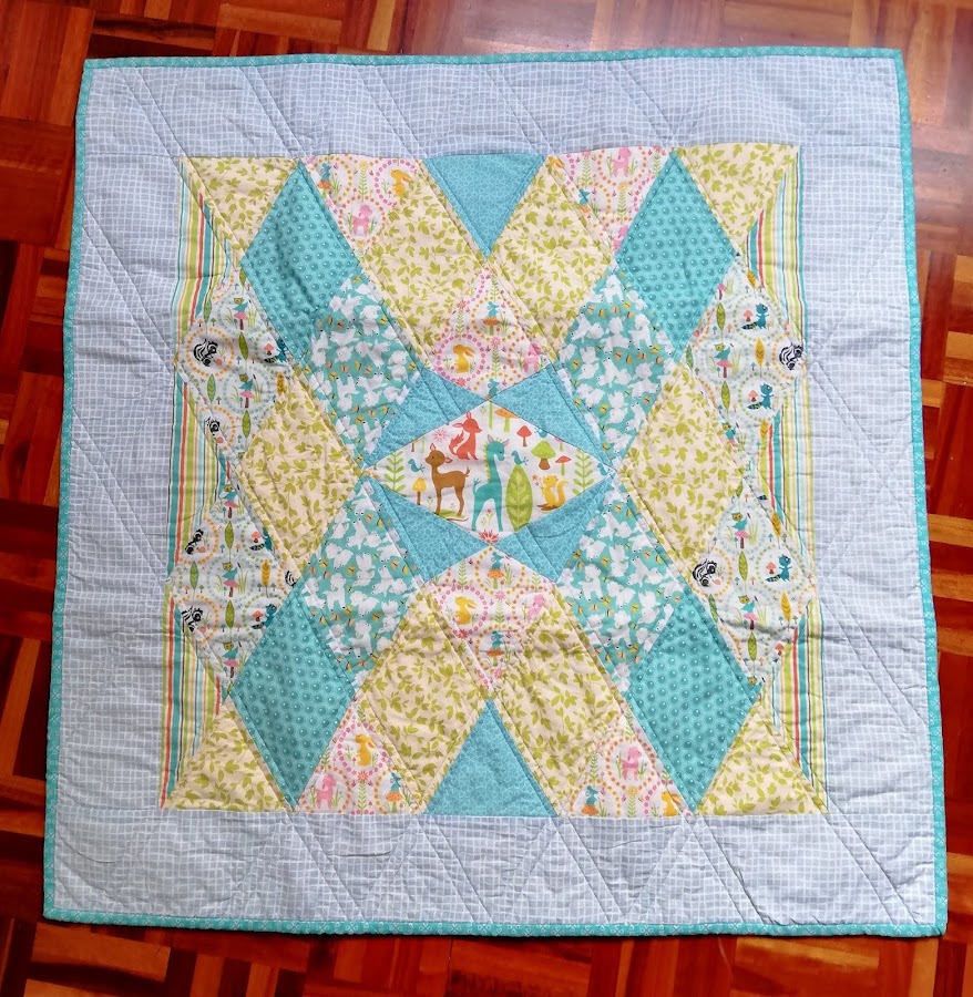 El acolchado que le hice fue muy sencillo. Líneas rectas a cada lado en cada unión, pero sin llegar al rombo del centro. De esta manera queda un acolchado en diagonal muy interesante.