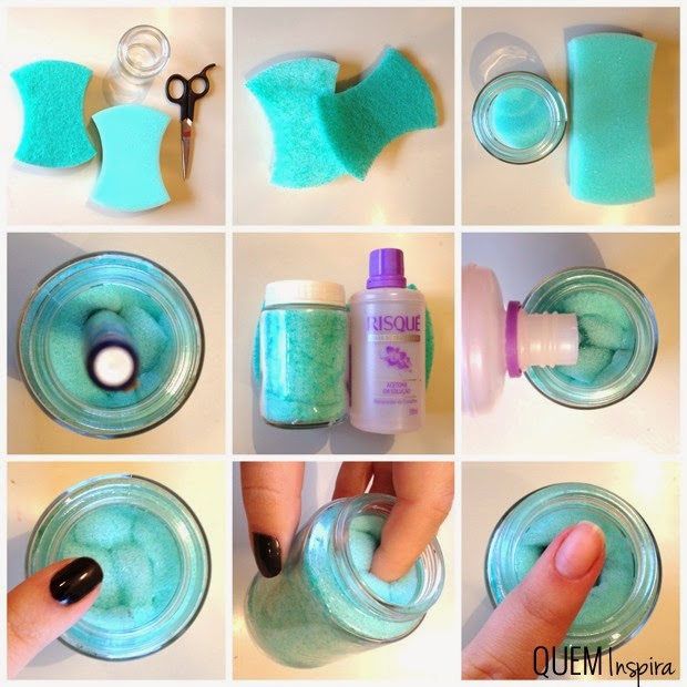 Primero le retiraremos la parte que no sirve del estropajo, A continuación meteremos las esponjas en el bote dejando un hueco en el centro para poder mete el dedo, para ello podemos utilizar cualquier cosa en forma de cilindro, como una barra de labios. Ya solo nos queda añadir el quita esmalte y ¡¡¡Listo!!!.
