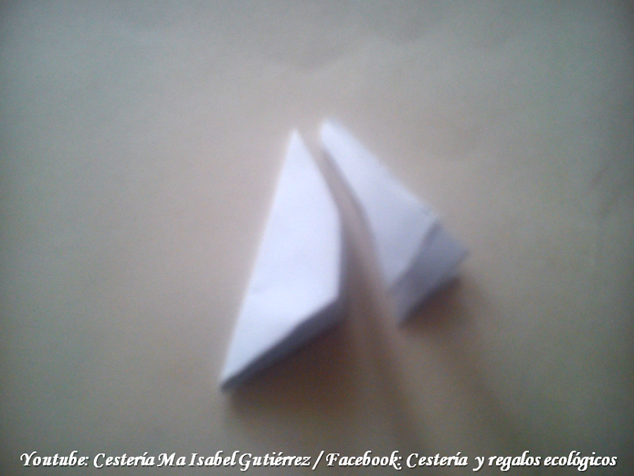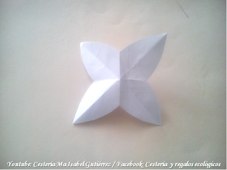 Aparte, hacemos un molde para las flores cortando un cuadrado de papel de aproximadamente cinco centímetros de cada lado, doblamos a la mitad el cuadrado, luego, nuevamente a la mitad y hacemos un tercer doblez para que quede un triángulo como se ve en la cuarta imagen...