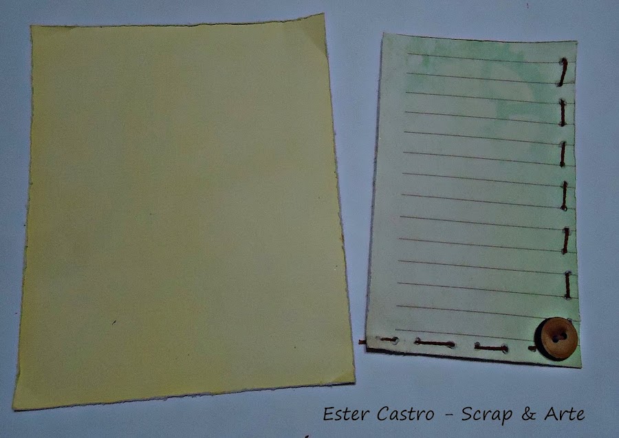 Prepare dos Mat (alfomirtas) una con la lámina Amarilla de la Línea Vacaciones cortada un poco más grande que la foto que utilicé y para la otra una Mini Lámina de la Línea Tan Solo Ayer de Color Verde Claro a la cual le realice una costura a mano con hilo encerado donde incluí también un botón de madera.
