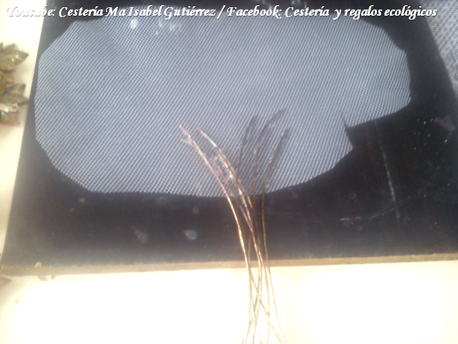 Preparamos un retazo ovalado de tul grueso y duro sobre alguna superficie de donde podamos despegar luego el silicón... el tamaño del tul depende de cuantas flores vamos a pegar en él... Primero pegamos los alambres como se observa en la imagen siguiente...