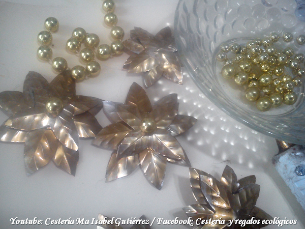 Decoramos el centro de cada flor pegando con silicón una falsa perla, yo aproveché un viejo collar de carnaval, que puedes conseguir también en tiendas de artículos para manualidades...