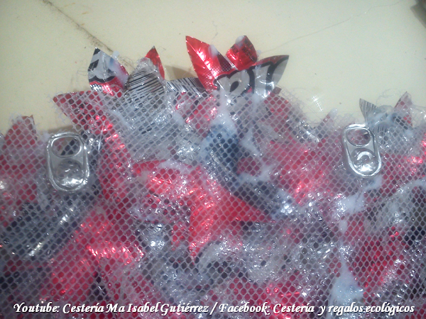 Finalmente pegamos dos anillas de latas por el reverso, en la parte superior y distribuyendo de manera que al colgar, el peso del árbol quede equilibrado...
