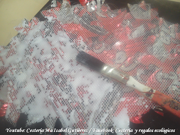 Volteamos nuestro trabajo y aplicamos una capa generosa de barniz transparente, esto es para endurece bastante el tul y conserve la forma plana...