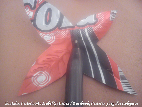 Por el reverso de las piezas, o sea, sobre la parte coloreada del aluminio, con una pluma, hacemos una línea por en medio de cada pétalo y pequeñas líneas a los lados, simulando nervaduras de hojas...