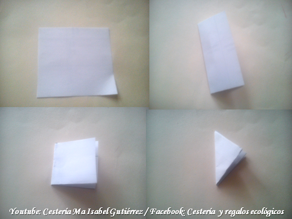 Aparte, hacemos un molde para las flores cortando un cuadrado de papel de aproximadamente cinco centímetros de cada lado, doblamos a la mitad el cuadrado, luego, nuevamente a la mitad y hacemos un tercer doblez para que quede un triángulo como se ve en la cuarta imagen...