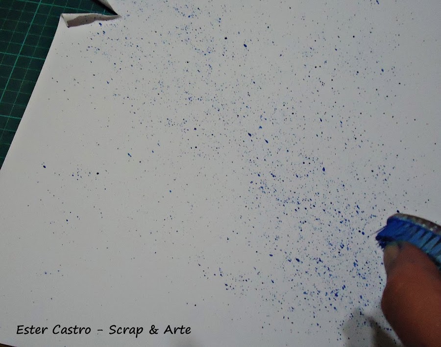 Luego realice con acrílico azúl un salpicado en diagonal con un cepillo de diente