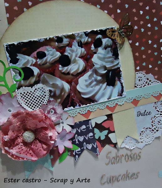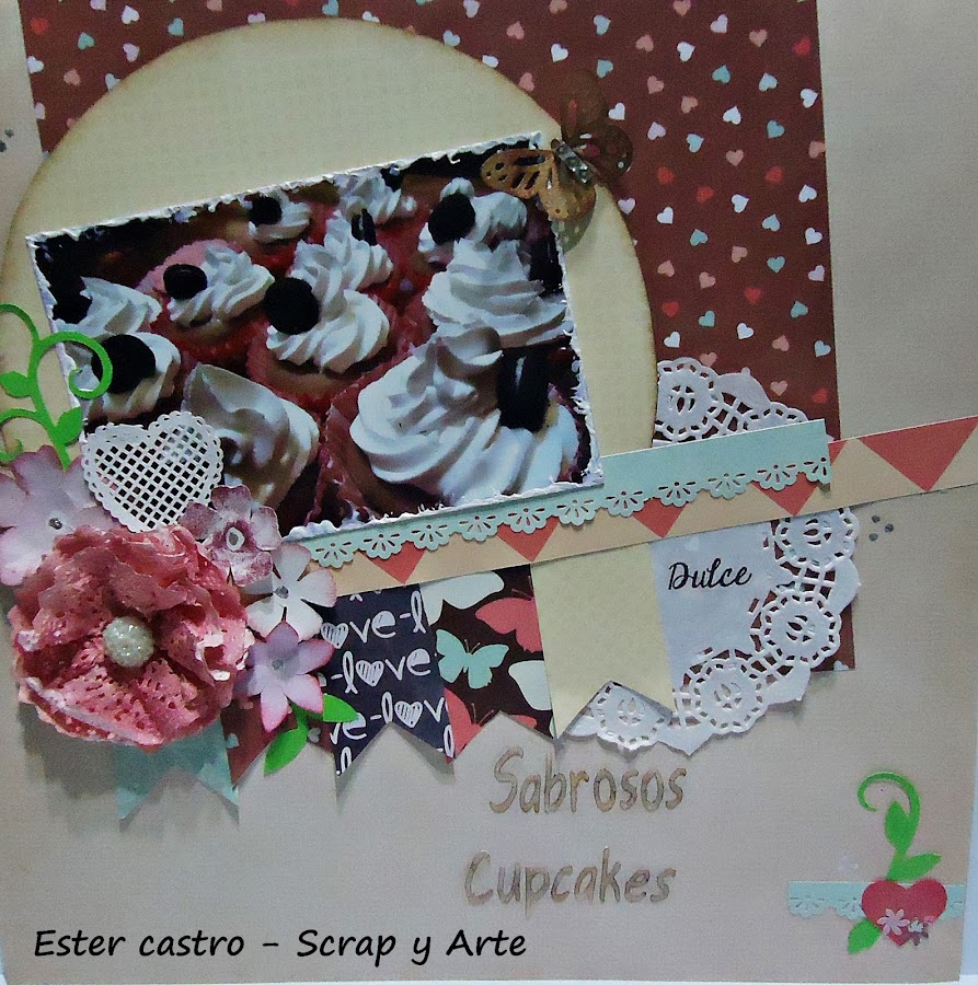 Evidencia: Utilicé Hojas y Tallos, Animales/Insectos (Mariposa), Medio Húmedo (Intervención del borde de la foto con acrílico) imitando la crema de los cupcakes y Puntos de esmalte (en el centro de las flores y en algunas partes de la base del LO en color plateado)
