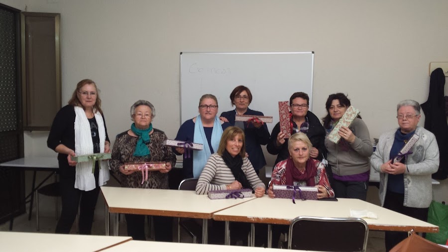 En Guardamar hemos hecho ya dos turnos para hacer una caja de abanico y aún nos queda hacer un nuevo turno. Son casi todas de los grupos de bolillos y bordados, unas verdaderas artistas. Chicas, gracias a todas por vuestro entusiasmo, han sido dos días muy agradables y lo he pasado muy bien con todas vosotras. Nos vemos pronto en un nuevo taller que ya he visto que os ha picado el gusanillo del cartonaje, jajaja