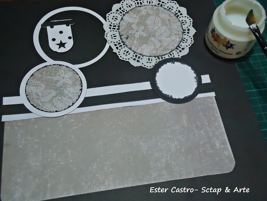 Sobre la Lámina Negra de la Línea Tendencia que elegí para la base de mi layout, pegue primero el rectángulo gris y las tiras, luego en uno de los círculos aplique un Ganchito y luego lo pegue sobre otro círculo, sobre una blanda aplique otro círculo con diseño de puntilla y así fui combinándolos y armando el mat (alfombrita).