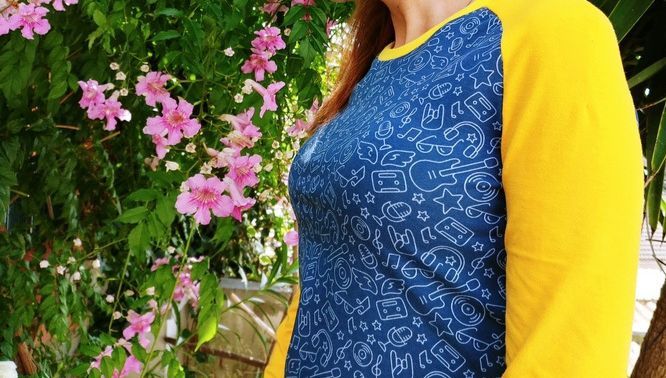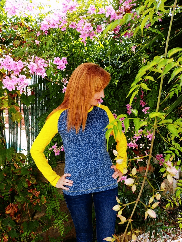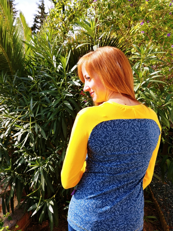 Mi versión, con camiseta estampada muy yo, enun azul precioso y un montón de iconos musicales muy divertidos, combinada con punto liso en amarillo, que ya sabéis que me gustan mucho los contrastes! El puño del cuello también amarillo y en el bajo y las bocamangas una simple puntada zigzag triple (y la recubridora guardada...). Todas las telas son de Cal Joan.