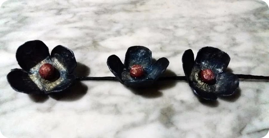 Mientras endurecen los corazones de mis flores , pinto de negro las flores , cuando estén secas con el pincel a media carga , le doy unas pinceladas con un acrílico azul metálico, y finalmente ( una vez seco....) con el pincel seco le doy unos toques con un ligerísimo tono dorado ( lo he mezclado con pintura blanca para quitarle fuerza al dorado ).