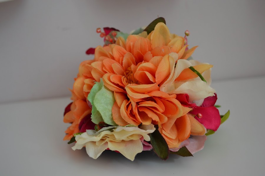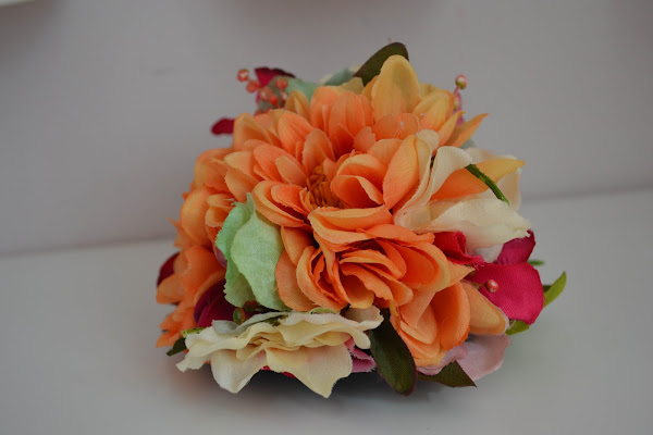 En una cara del ramillete he colocado dos flores naranja fuerte y decorado con flores pequeñas como hortensias, la otra cara está hecha con varias flores distintas.