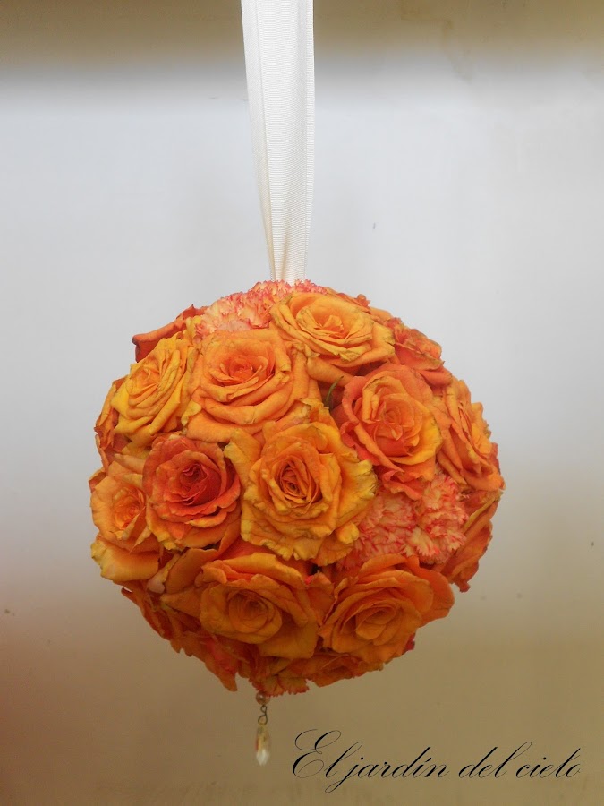 Hasta ahí bién. Es la primera vez que lo hago y no sabía que estas esferas comen flores por un tubo. Después de haber encargado 40 rosas y una esfera pequeña, no me daban para cubrir la bola, me faltaba toda la parte de abajo y ya no quedaban mas flores de estas en la floristería, así que después del agobio , bajé por la mañana poco antes de la boda , bola en mano a ver que encontraba y le puse clavellinas del mismo color rellenando los huecos.