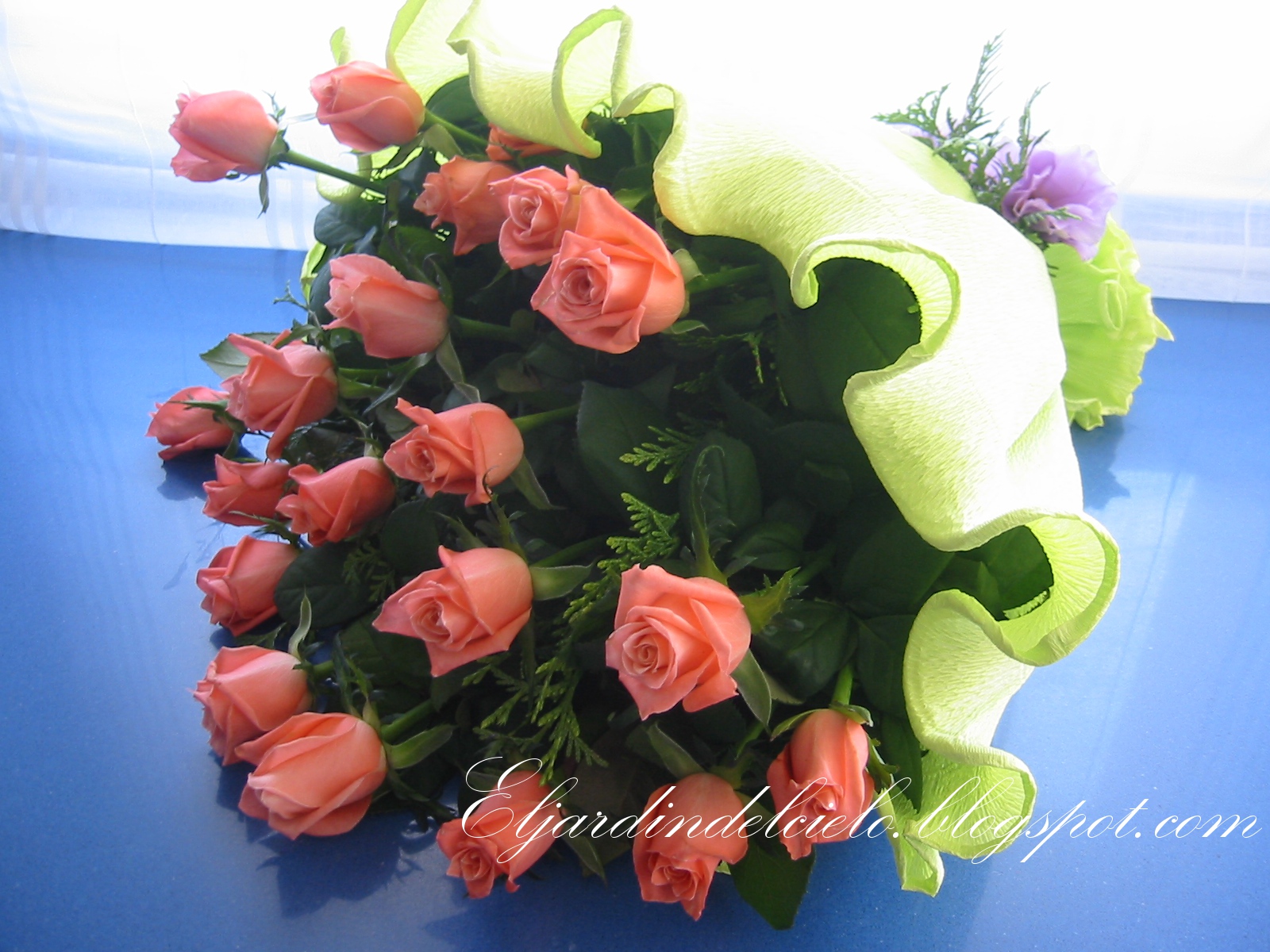 Ayer fué el cumpleaños de mi mujer y le regalé este ramo de rosas pequeñas y de color rosa que me gustaron mucho cuando las vi. Son de una variedad que no se abre más de lo que se ve en la foto y duran bastante tiempo.