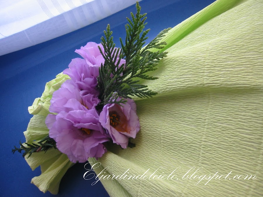 Envuelto en papel pinocho rizado y el detalle de la parte de abajo donde se atan las flores que era de Lisanthus Lila.