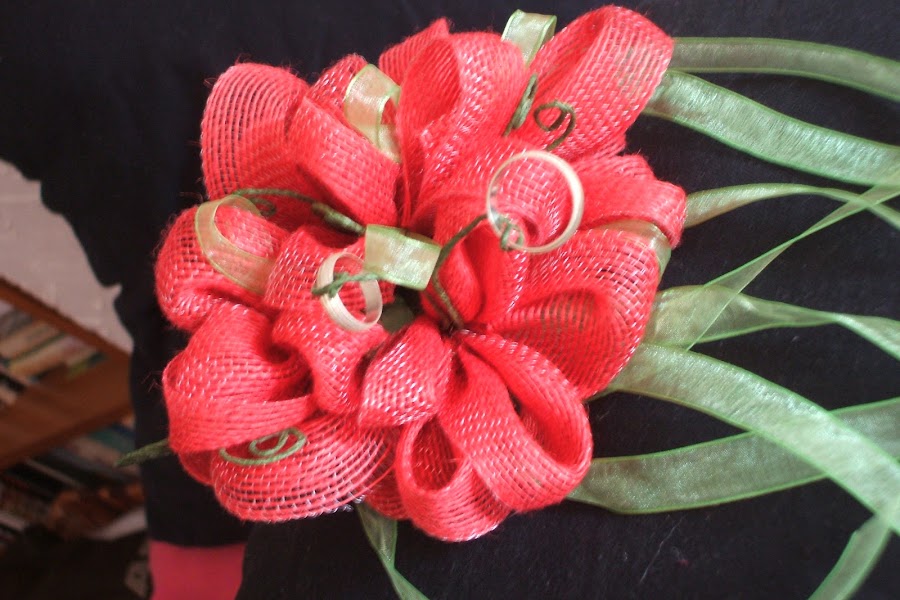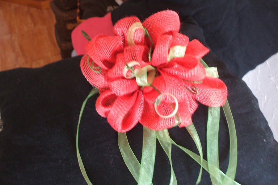 Así que para una niña de dos años le he hecho un pequeño ramo en el cual he insertado unos estambres que se enrollan y en ellos se les enganchan las alianzas así no hay problema porque el ramo es fácil de llevar con una mano y andar como a ella le guste. Además como las niñas son tan coquetas y sobre todo esta, pues he dado en el clavo y ella encantada con su ramo.