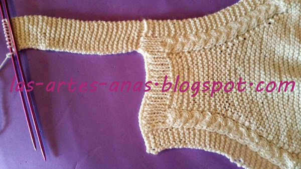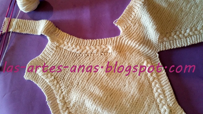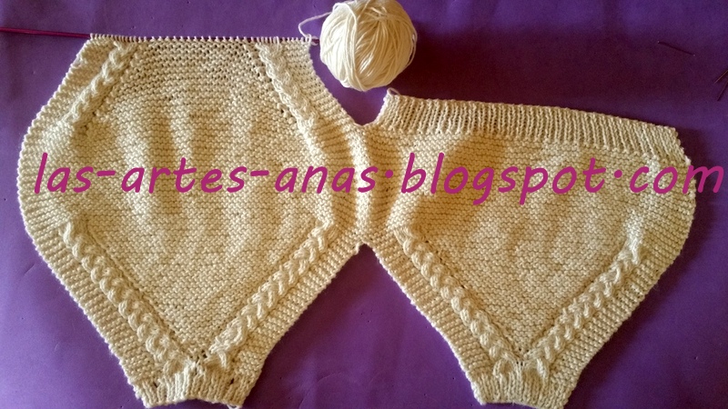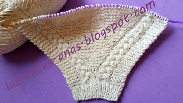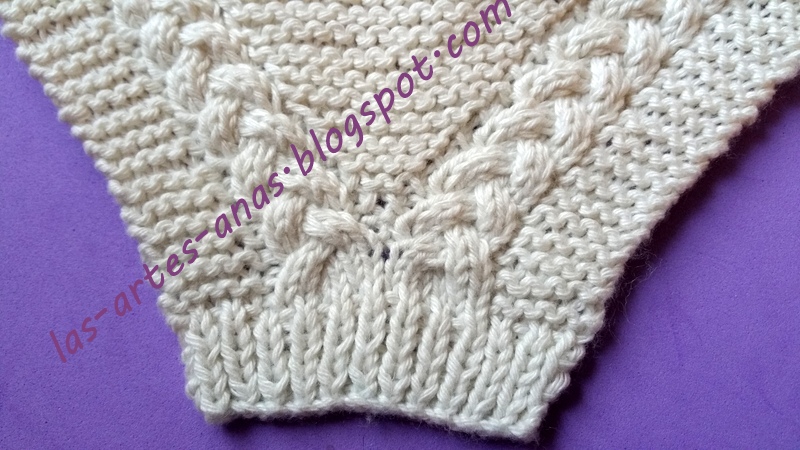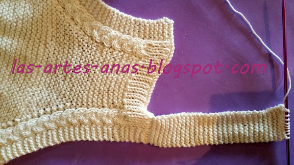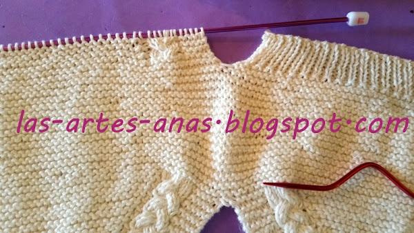CUANDO ALCANZAMOS 7 cms desde la abertura con trenza, separamos la labor, TEJIENDO SOLO LA MITAD DE LOS PUNTOS, O SEA 69 puntos para la cenefa de la ranita durante 2 cms, con un punto derecho, 1 punto revés