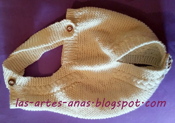 Cuando alcanzamos 14 cms de trenza, tendremos mas o menos 69 puntos, los dejamos en ESPERA Y TEJEMOS la parte delantera, LIGERAMENTE MAS LARGA,, CON 1centimetro y medio ES SUFICIENTE, PARA LA SOLAPA DE ABROCHADO