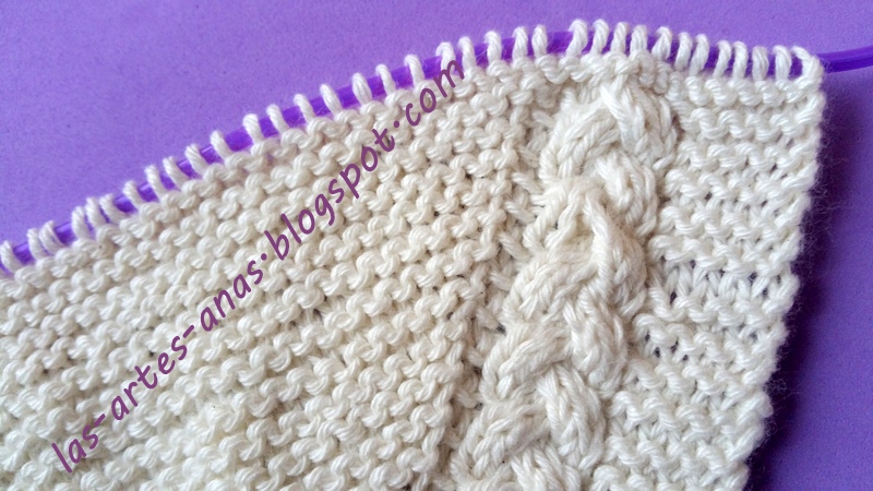 1º vuelta:(borde)5 puntos derecho, 1 p. revés, 6 derecho(trenza), 1 revés 1 aumento(centro de la trenza), 6 derecho (trenza)1 revés y 5 derecho (borde