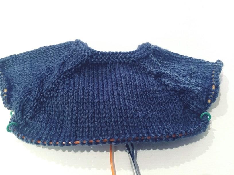 Tejemos en punto jersey haciendo los cruces cuando corresponda. A partir de hay que unir para trabajar en redondo. Puedes seguir tejiendo recto y coser luego.