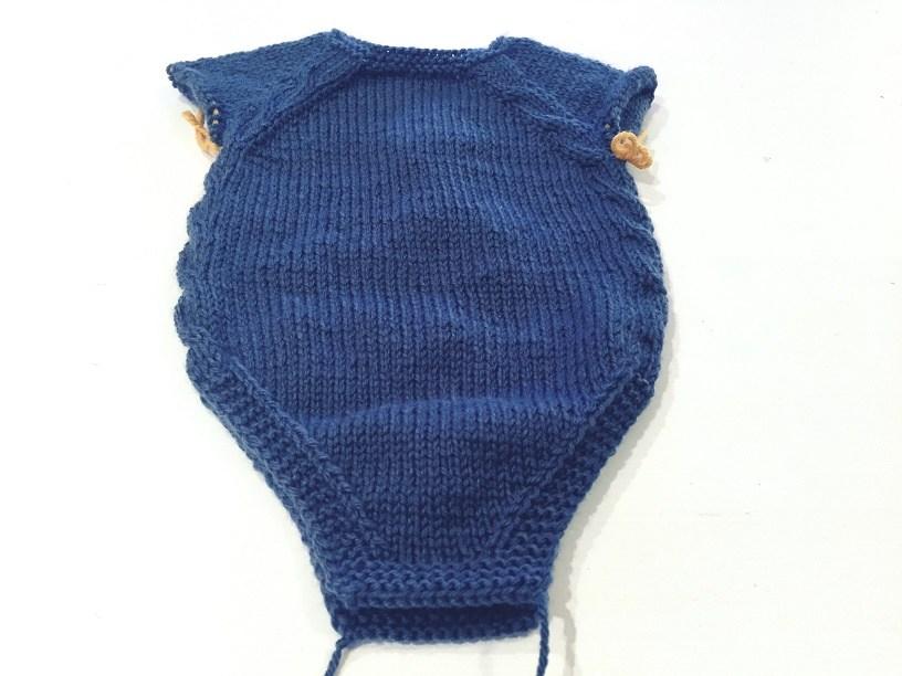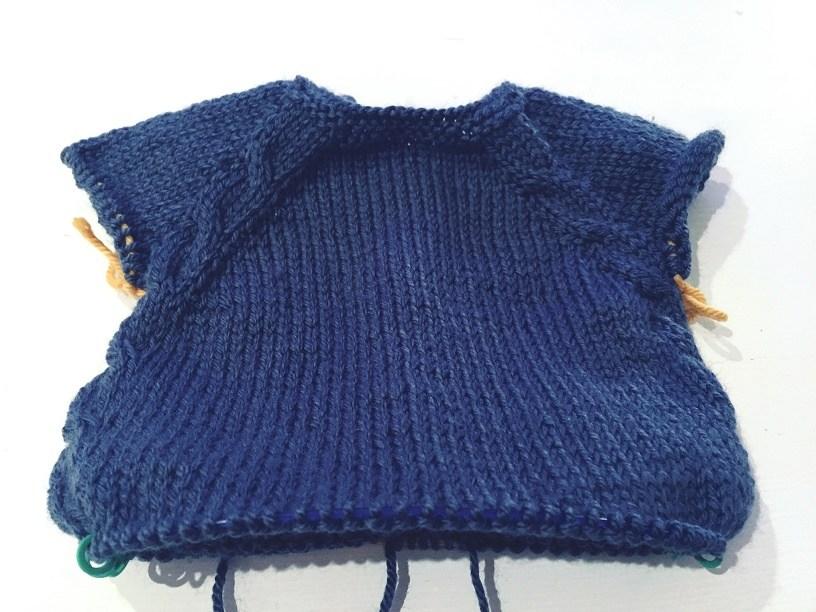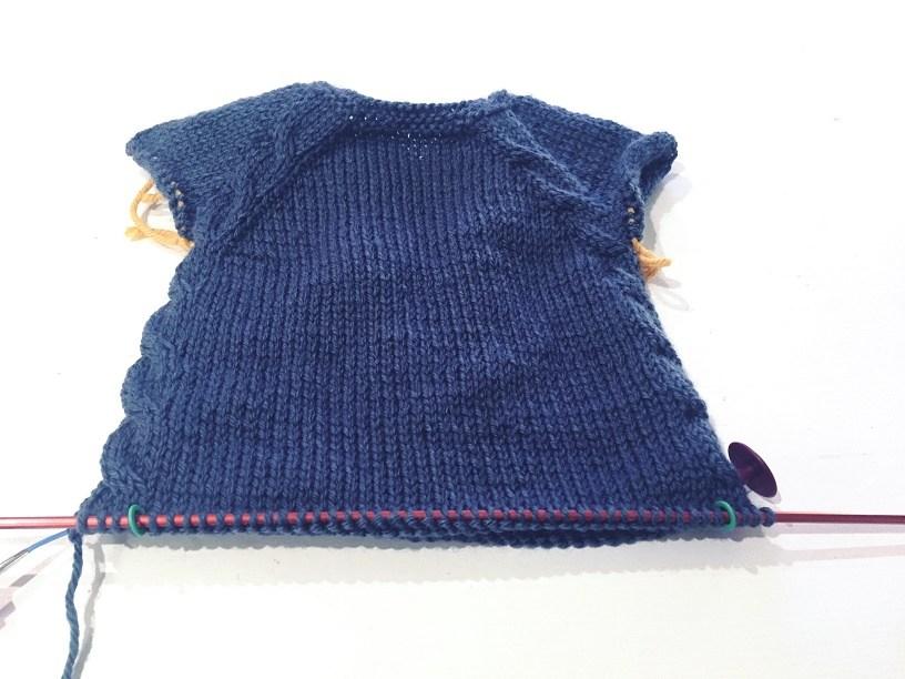 Tejiendo canesú. Pasada 23: 4 puntos derecho, 11 puntos derecho, 1 punto derecho y retorcido por detrás, 4 puntos derecho, 1 punto derecho y retorcido por detrás, 25 puntos derecho, 1 punto derecho y retorcido por detrás, 4 puntos derecho, 1 punto derecho y retorcido por detrás, 28 puntos derecho, 1 punto derecho y retorcido por detrás, 4 puntos derecho, 1 punto derecho y retorcido por detrás, 25 puntos derecho, 1 punto derecho y retorcido por detrás, 4 puntos derecho, 1 punto derecho y retorcido por detrás, 11 puntos derecho, 4 puntos derecho.