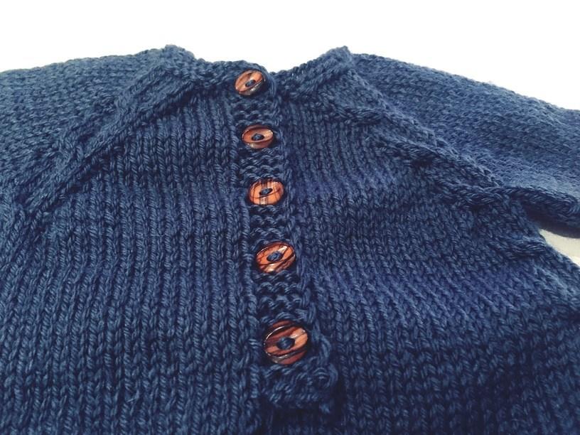 Dejamos los puntos de las mangas en espera. Pasada 34 (ojal): 2 puntos derecho, hebra, 2 puntos juntos, 86 puntos revés, 4 puntos derecho.