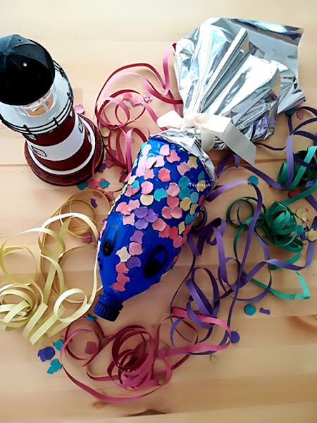El material es muy simple, una botella de plástico, pintura acrílica de color azul, papel de regalo plateado o de un color llamativo, celo, una cinta o lazo, pegamento, un pincel, confeti y rotuladores negro y blanco (o pintura)