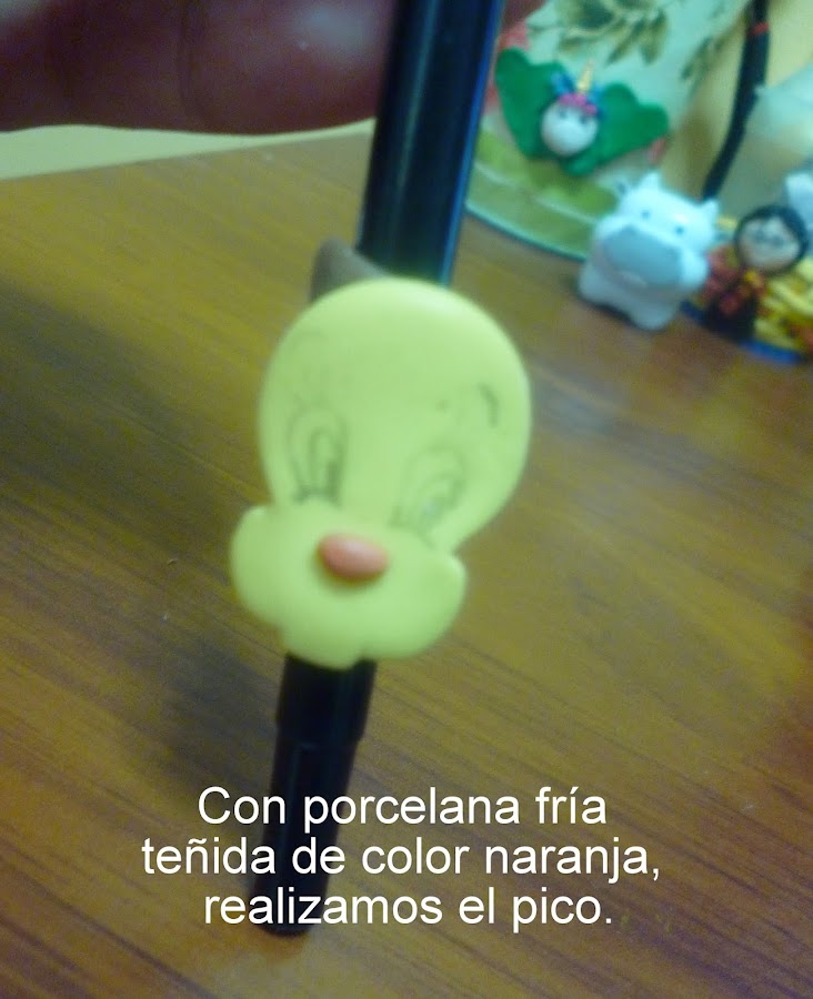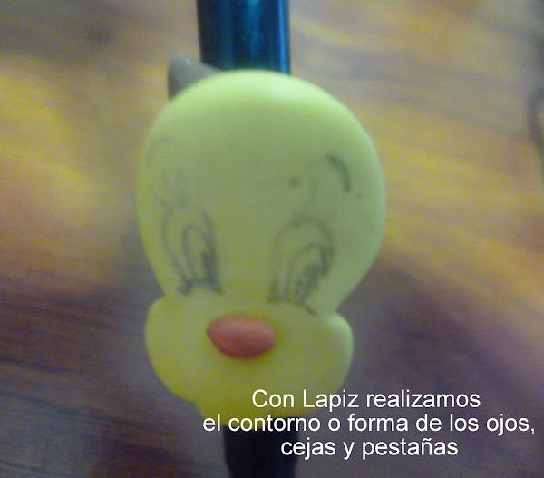 Realizamos el pico con una porción muy pequeña de porcelana fría. Y de manera de "borrador" dibujamos con lápiz los ojos.