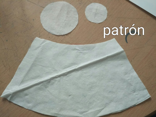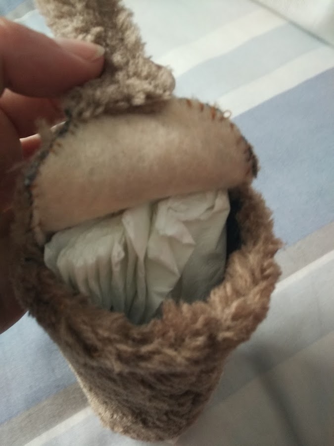 Para la parte inferior del cuerpo, de nuevo dos piezas iguales redondas un poco mas grandes que la boca del vaso, se unen ambas partes y se cosen. Procedemos a unir esta pieza al cuerpo pero debemos dejar la mitad al aire, para abrir y cerrar de esta manera luego podemos guardar dentro los pañuelos. Como último detalle le añadi un trocito más de tela para hacer el rabito, cosido en esta ultima pieza. Sacamos el vaso de dentro , le hacemos un corte en la base en forma de cruz , le damos la vuelta a la pieza y volvemos a meter el vaso.