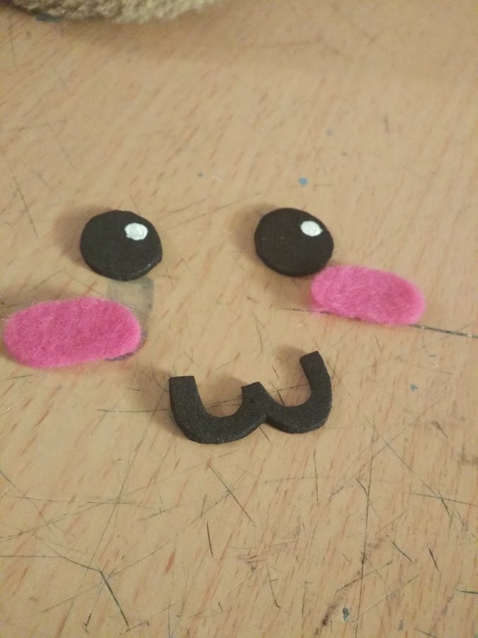 Añadimos los detalles de la cara , que cortamos con gomaeva y fieltro, podemos pegar con cola blanca o pistola de silicona caliente.