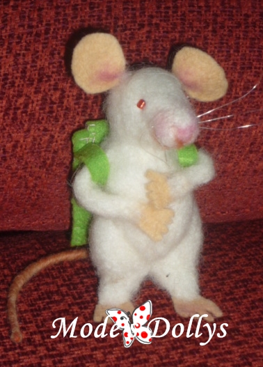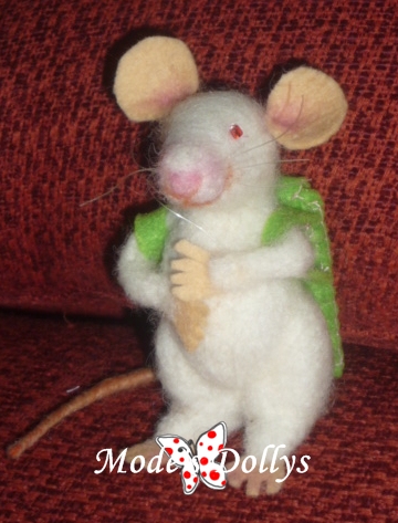 Su mami me encargó un regalito especial para su pequeñín, que está a punto de cambiar los dientes. Como ahora me ha dado por la lana cardada, se le ocurrió que podía hacérselo con esta técnica. Así que me puse manos a la obra y salió el Señor Pérez. Lleva a su espalda una gran mochila para guardar el diente caído y ser sustituido éste por un euro. Está hecho enteramente en lana cardada, tiene todos los detalles: manitas y pies de fieltro, su rabo largo, su naricilla rosada y sus ojillos rojos, también sus bigotes. Espero que a mi amiga le guste, y sobre todo a su chico. Lo que no me esperaba es que iba a tener tanto éxito e iban a hacerme varios encargos con sólo publicar la foto en facebook.
