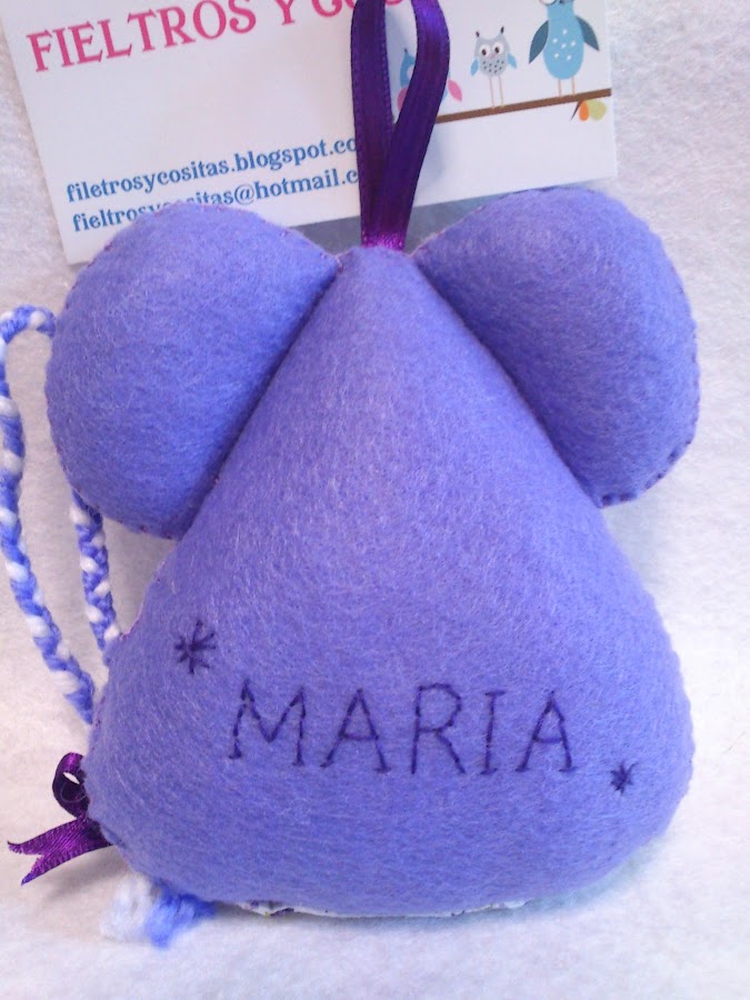 María esta empezando a perder sus dientecillos, y su abuela me pidió una Ratoncita en tonos lilas para que el ratón Pérez pudiera encontrar los dientes con facilidad.....además la personalizé con el nombre de su dueña...espero que sea de su gusto...
