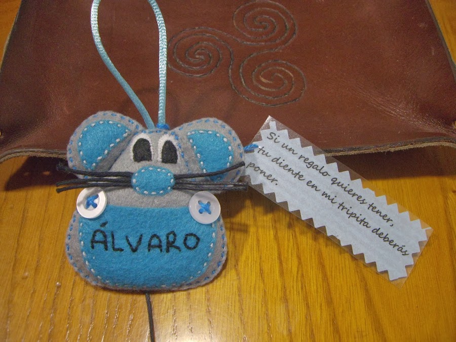 Ratoncito Pérez guardadientes en gris con detalles en azul para Álvaro
