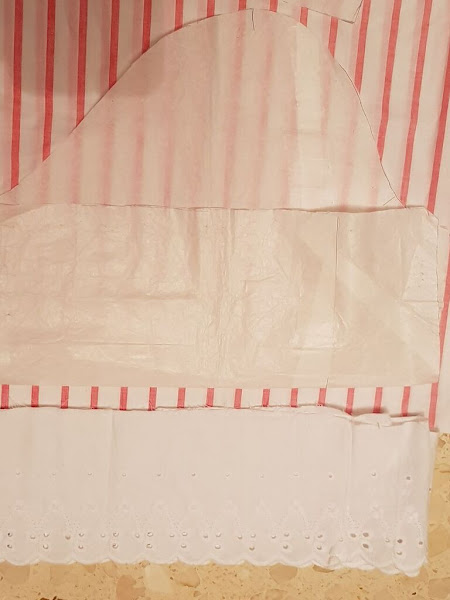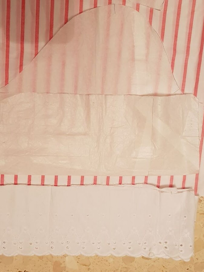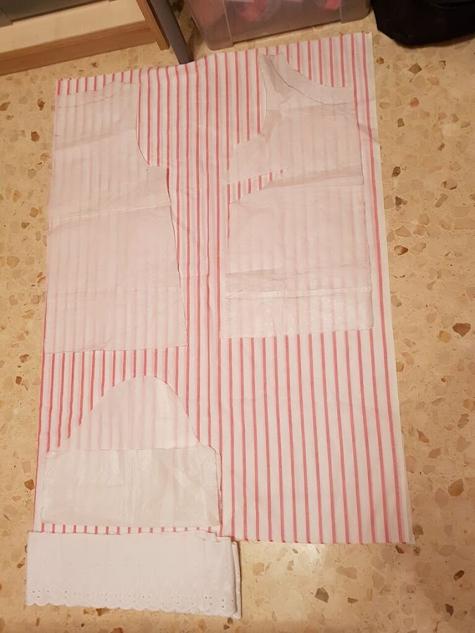 Al colocar los patrones en la tela vi que la manga no salia entera asi que busque entre mis cosas y encontre una puntilla ancha y bordada para acabar la manga.