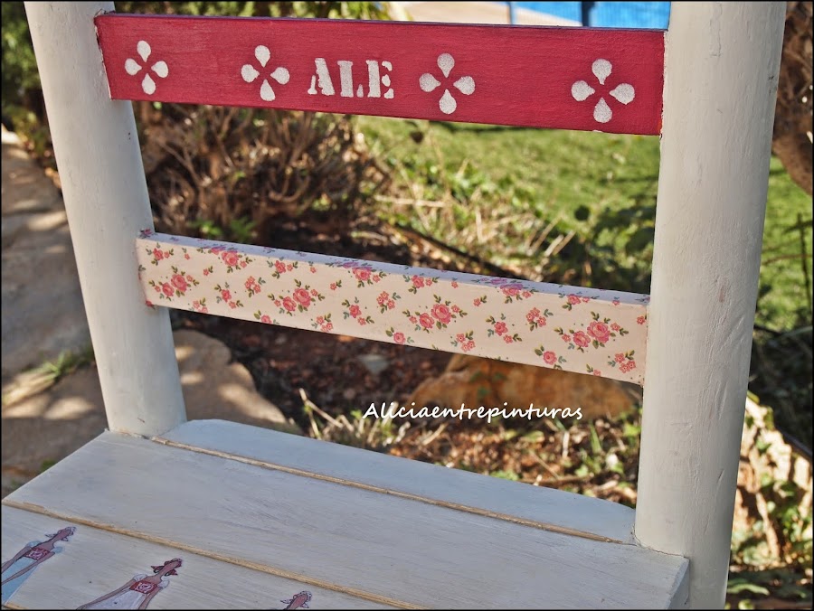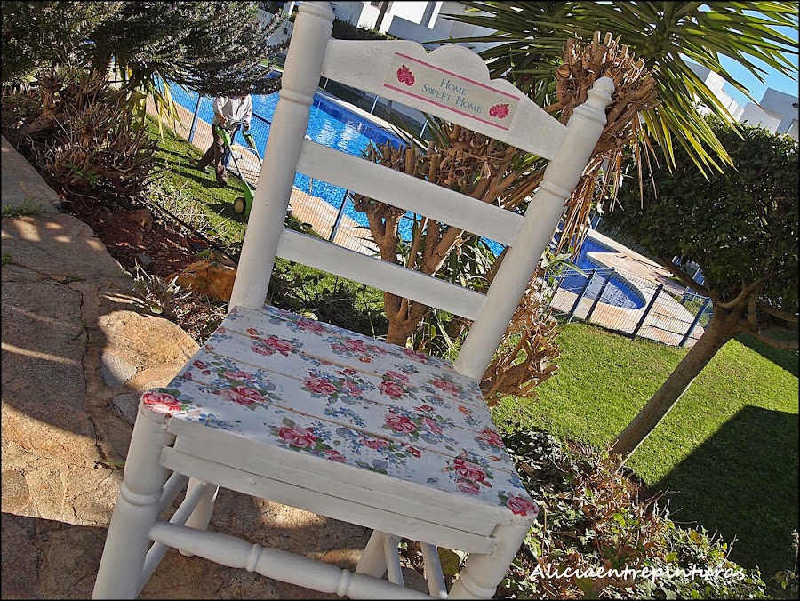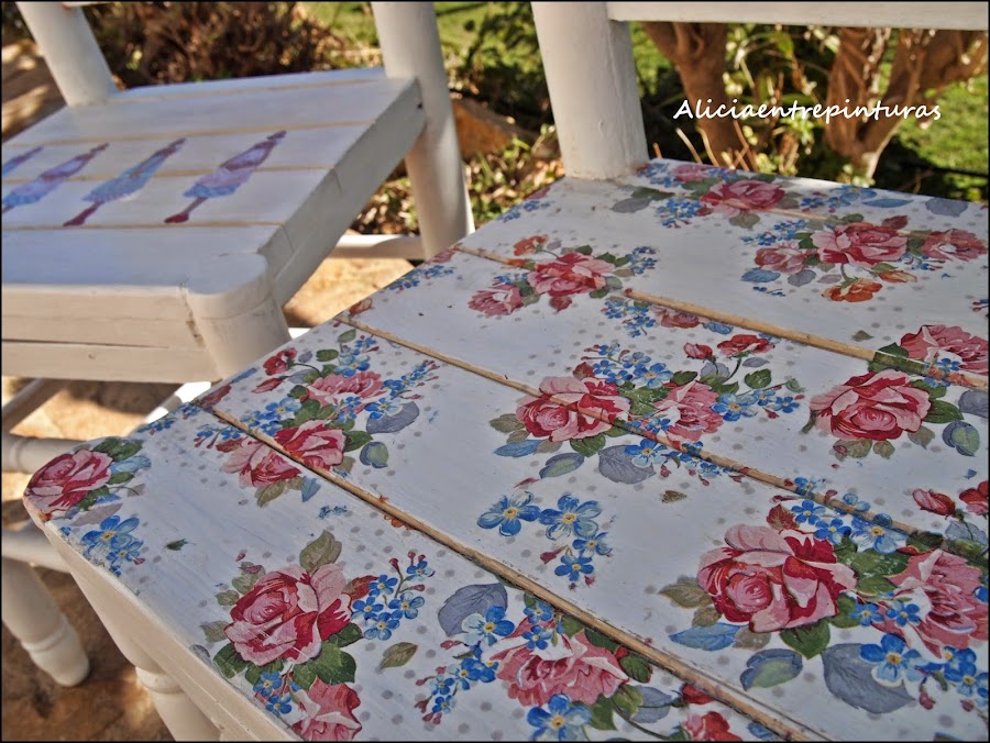 Decoupage en el asiento y en alguna tabla del respaldo.