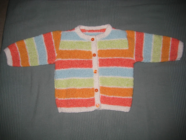 Fui combinando 14 pasadas de color con 2 pasadas en blanco. Todo en punto del derecho excepto puños, cuello y solapa delantera para abotonar con punto de goma. Así es como queda la Rebequita por delante y por detrás?