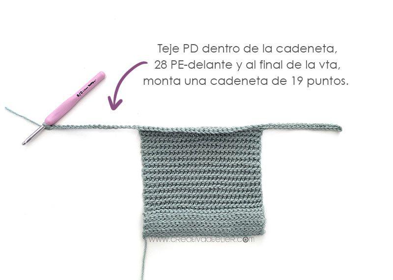 Gira tu labor y a partir de la segunda cadeneta desde la aguja, teje 18 PE dentro de la cadeneta, 28 PE- delante hasta el final. Al final de la vta, monta una cad de 19 puntos para formar el delantero.