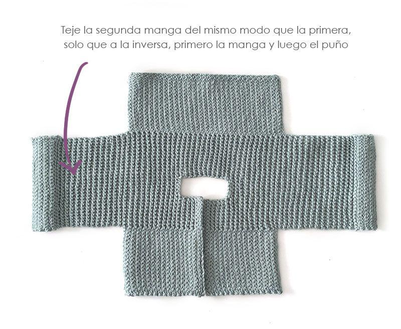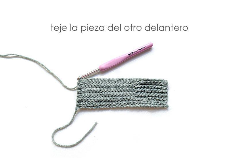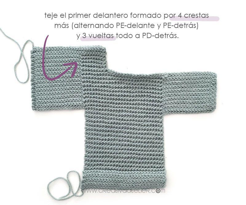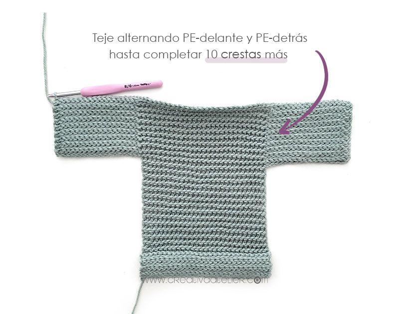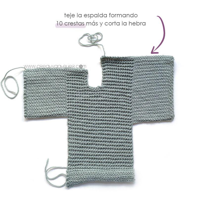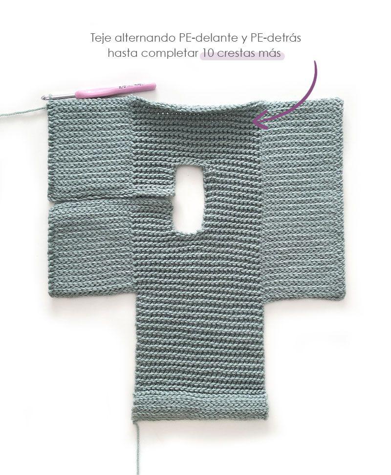 Teje de este modo hasta haber completado 10 crestas más desde que comenzaste a tejer delantero y espalda. Tendrás un total de 24 crestas.